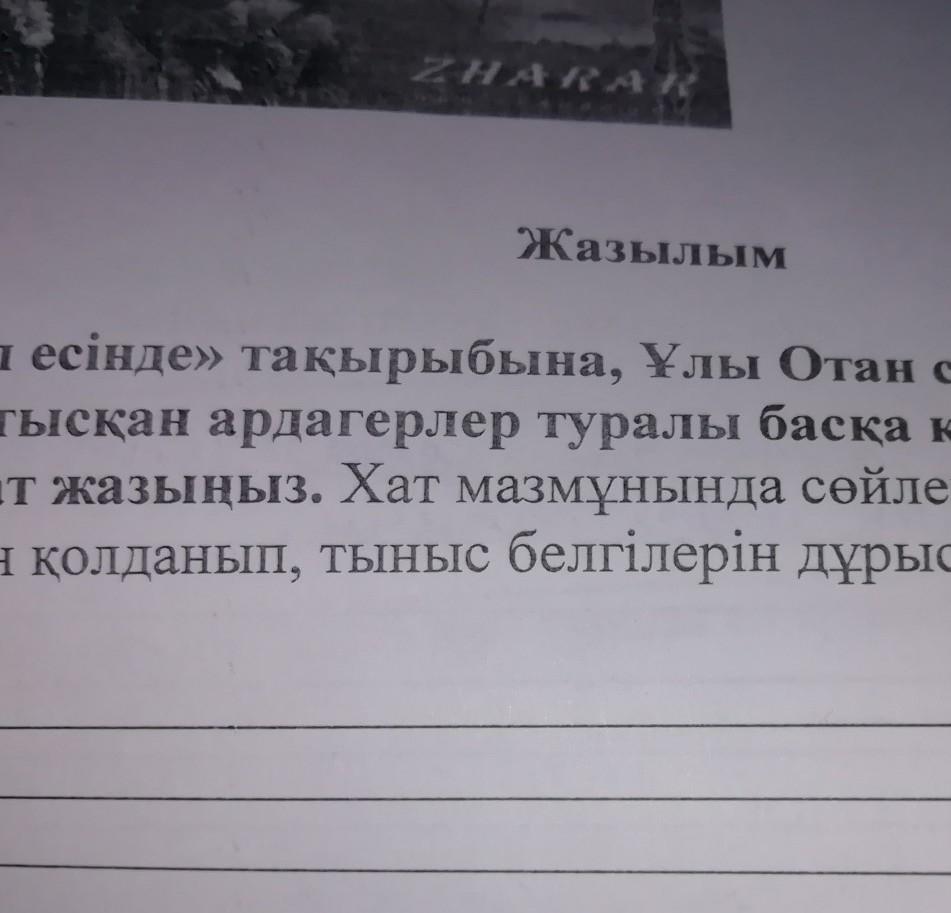 Сәлеметсіз бе, Құрметті Ұлы Отан соғысы ардагері! Сіздің Отан алдындағы, келешек ұрпақ алдындағы жасаған ерлігіңіз бен батырлығыңызды ескеріп алғыс айту үшін хат жолдап отырмын.