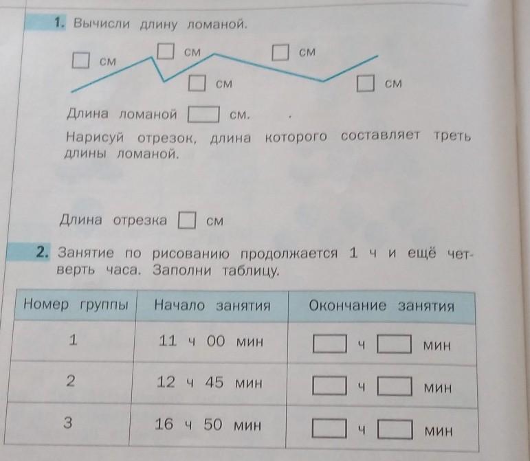 В №1 измерь линейкой каждый отрезок и внеси результаты измерений в квадратики, потом сложи. В №2 1 час с четвертью = 1 час 15 мин. Прибавляй и записывай.