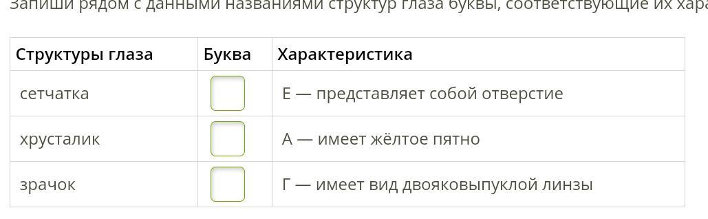 Запиши рядом с данными названиями структур глаза буквы, соответствующие их характеристикам.