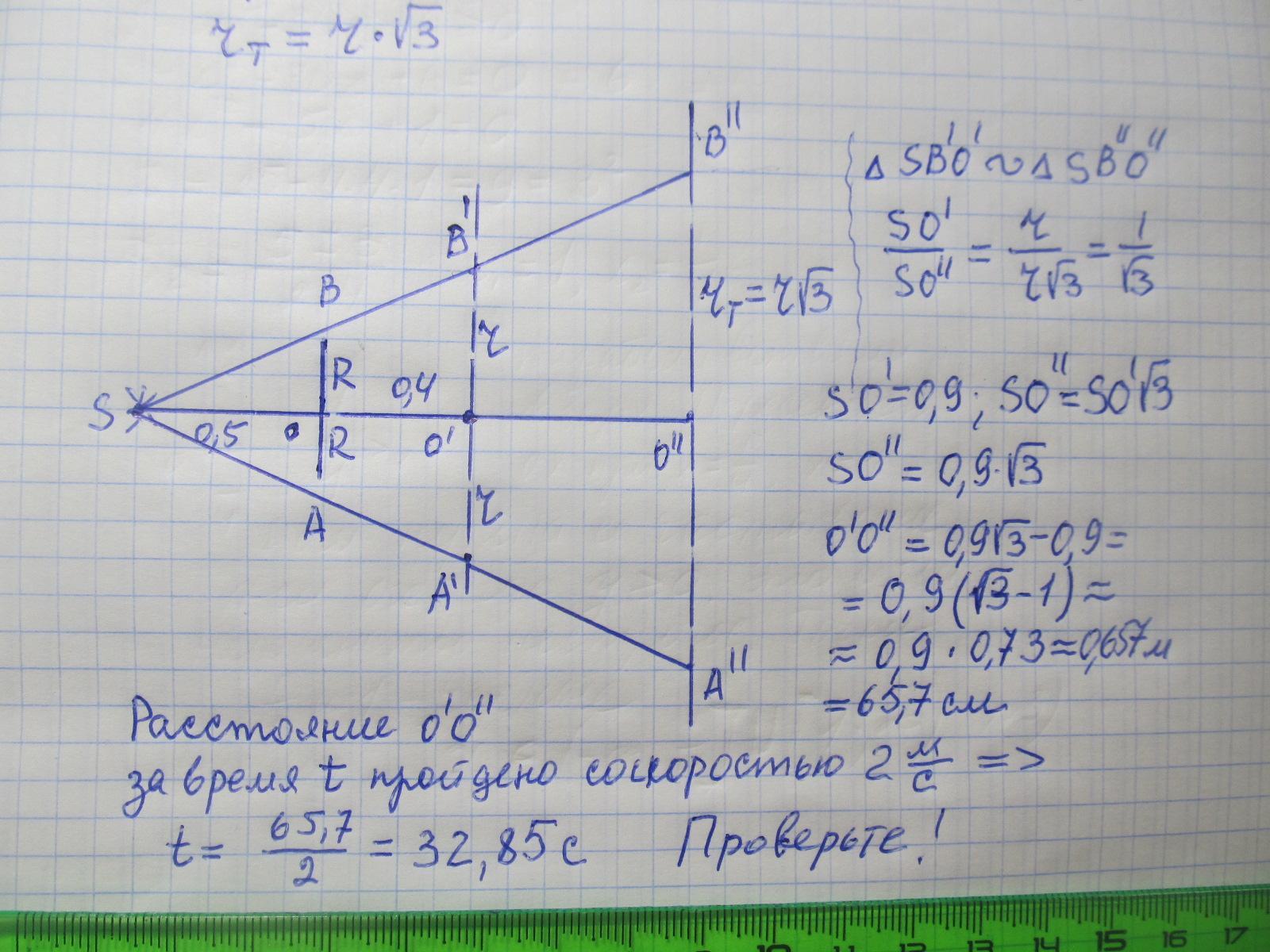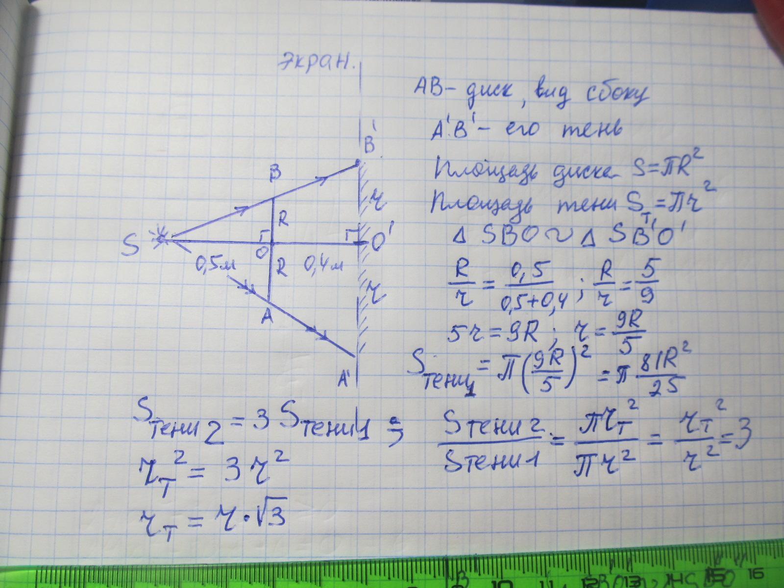 точечный источник Света расположен на расстоянии 0,5 м от диска. тень от этого диска падает на экран, которая располагается на расстоянии 0,4 м. экран начинают удалять со скоростью 2 см в секунду точка Через какое время площадь тени на экране увеличится в три раза?