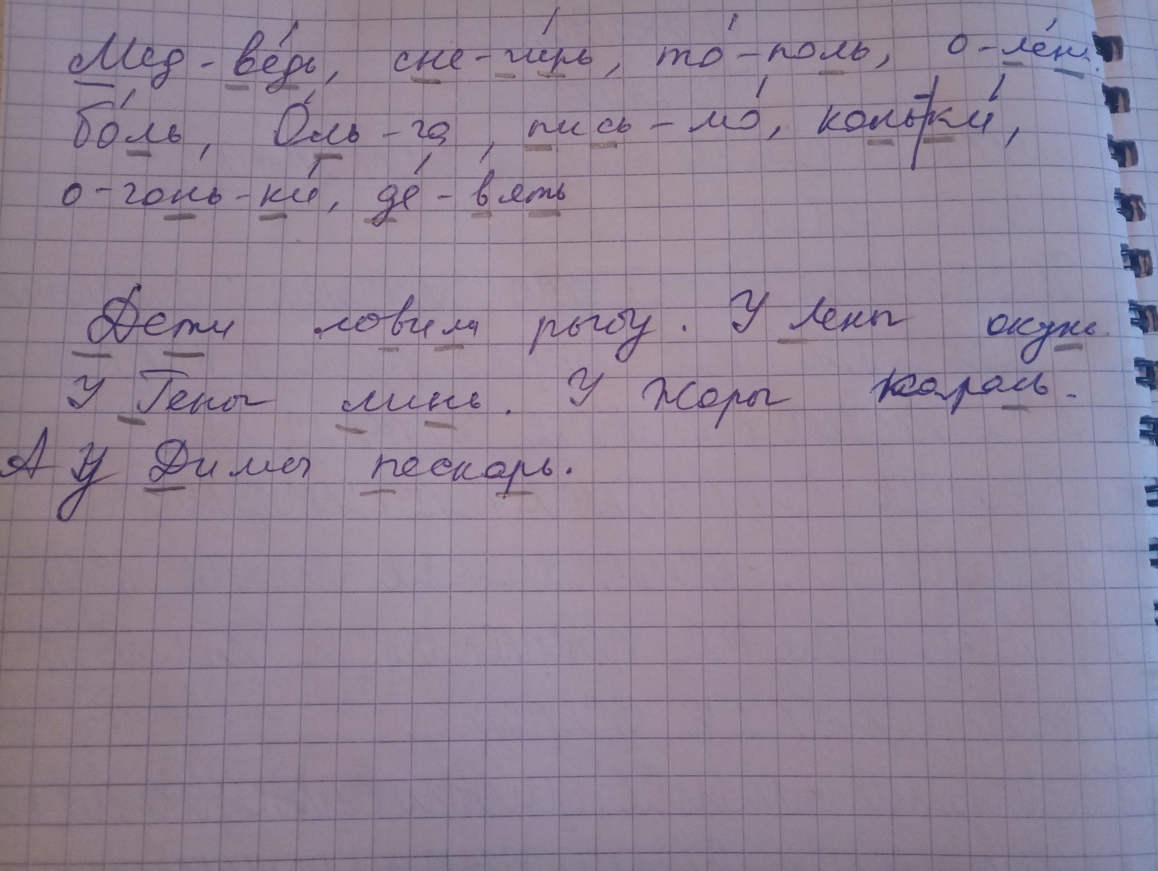1).Спиши. Раздели слова на слоги, поставь ударение. Подчеркни мягкие согласные.