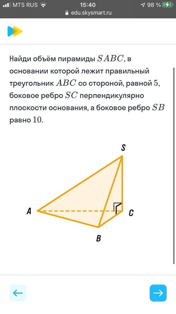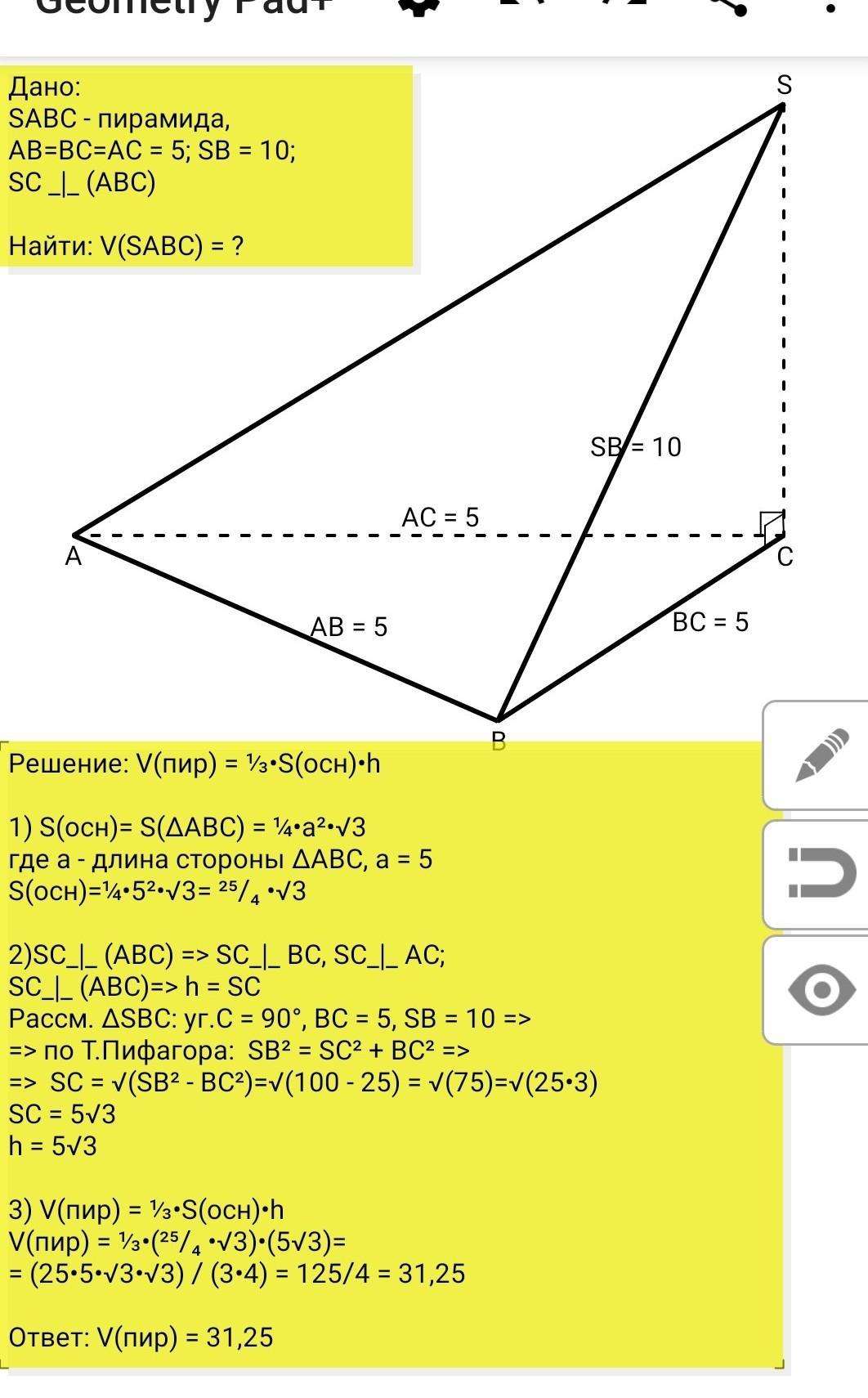 V = 1/3 * (25/4) *√3 * 5√3 = 125/4 = 31,25 ( см³ ) .