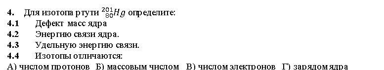 4.1. m=( 80*1.0073-121*1.0087)- 200.97028=1.6613 а.е.м