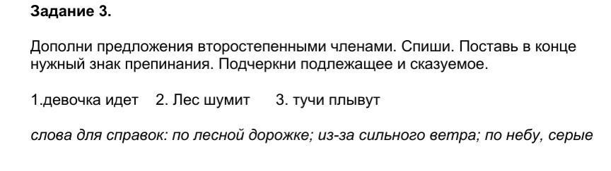 Дополни предложения второстепенными членами. Спиши. Поставь в конце нужный знак препинания. Подчеркни подлежащее и сказуемое.