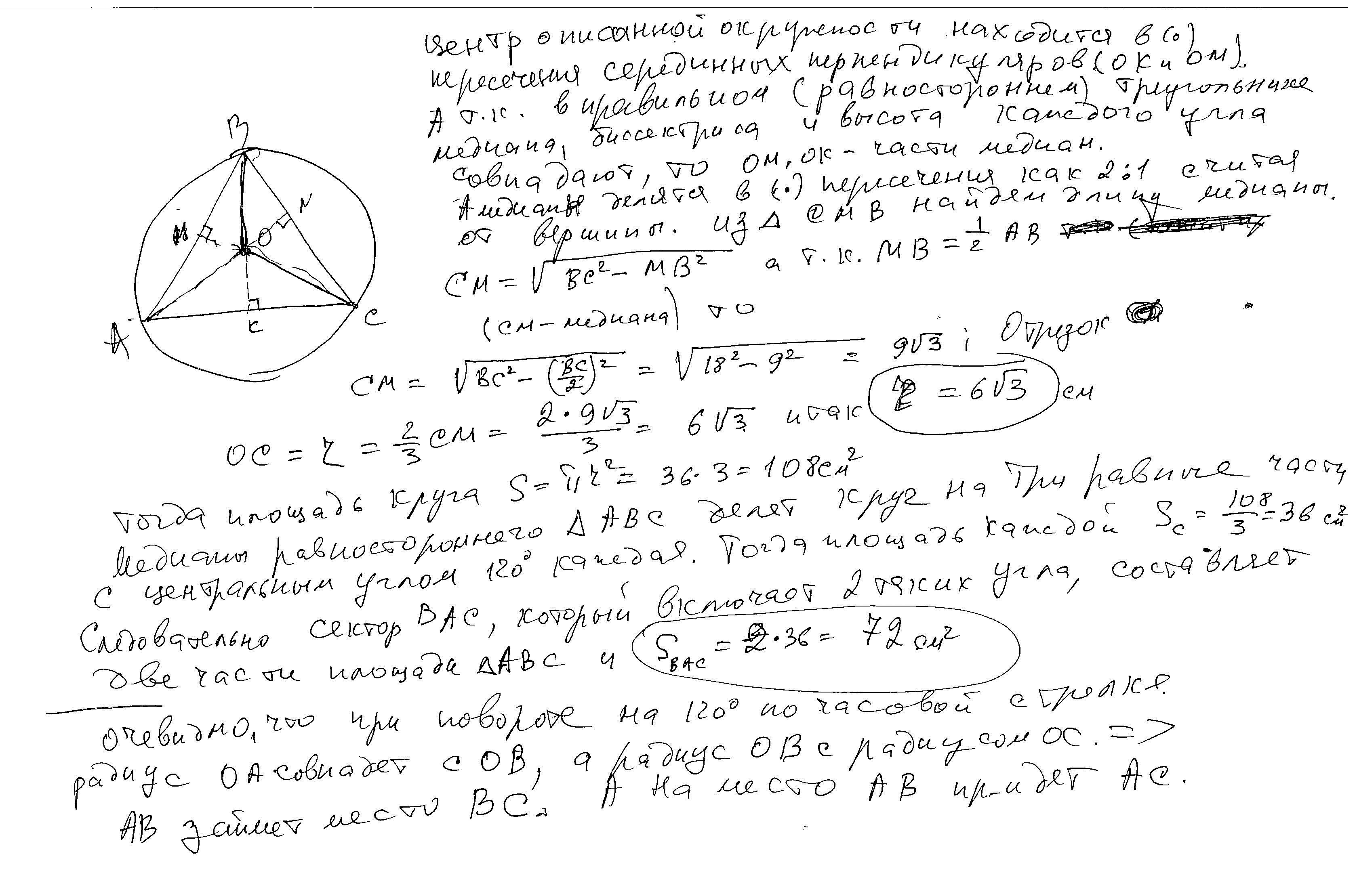 Навколо правильного трикутника АВС зі стороною 18 см описано коло із центром.(1) Знайдіть площу сектора, який містить дуту BAC.