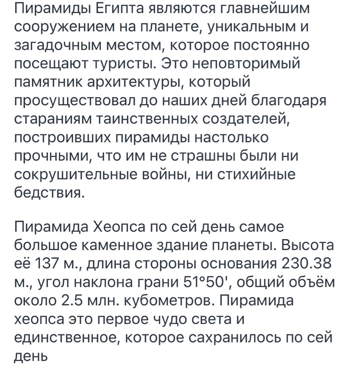 The pyramids of Egypt are the most important structure on the planet, a unique and mysterious place that tourists constantly visit. This is a unique architectural monument that has existed to this day thanks to the efforts of mysterious creators who built the pyramids so strong that they were not afraid of either crushing wars or natural disasters. The Pyramid of Cheops is to this day the largest stone building on the planet. Its height is 137 m, the length of the side of the base is 230.38 m, the angle of inclination of the face is 51 ° 50 ', the total volume is about 2.5 million cubic meters. The pyramid of Cheops is the first wonder of the world and the only one that has survived to this day.