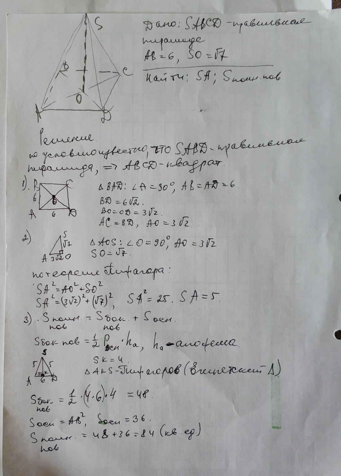 Здравствуйте помогите, пожалуйста SABCD - правильная пирамида. SO= корень из 7, АВ=6 Найти SA и Sпол