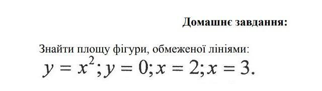 y = x² ; y = 0 ; x = 2 ; x = 3 . Будуємо графіки функцій : параболу ; вісь Ох ; прямі x = 2 ; x = 3 . Площу фігури , обмеженої цими лініями ,