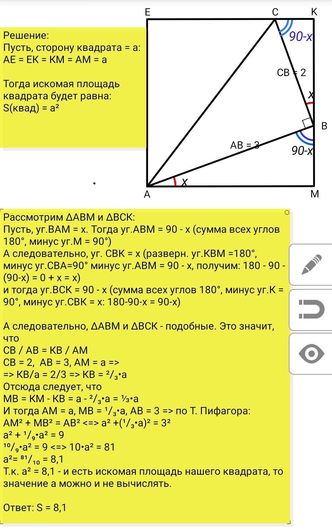 в квадрат вписан прямоугольный треугольник ABC с катетами AB=3см,BC=2см. вершина А совпадает с вершиной квадрата, а вершина B и вершина С лежат на сторонах, не включающих в себя вершину А. найти площадь квадрата