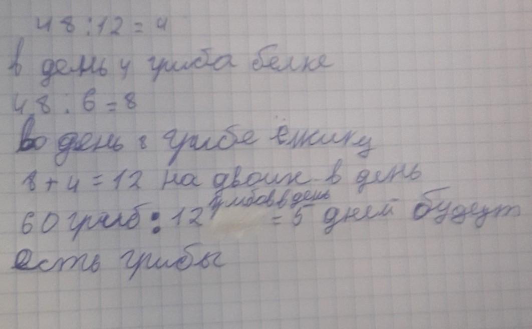 48 грибов белке хватит на 12 дней а ёжику на 6 дней.На сколько дней им обоим хватит 60 грибов если они будут есть вместе?