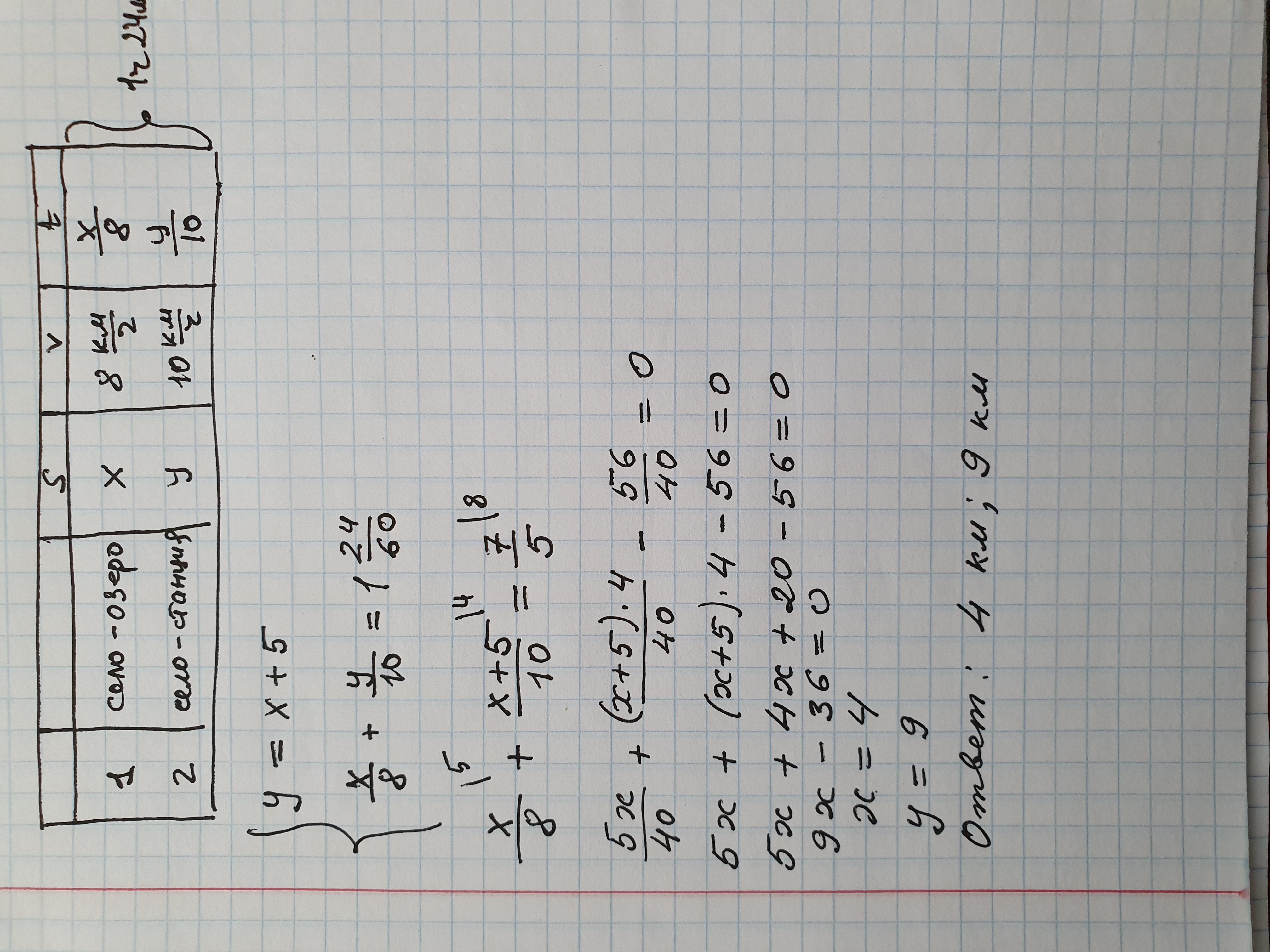 Велосипедист проезжает путь от озера до села со скоростью 8 км ч, а от села до станции со скоростью 10 км ч, затратив на весь путь 1 ч 24 мин. Чему равны расстояния от озера до села и от села до станции, если первое меньше второго на 5 км?