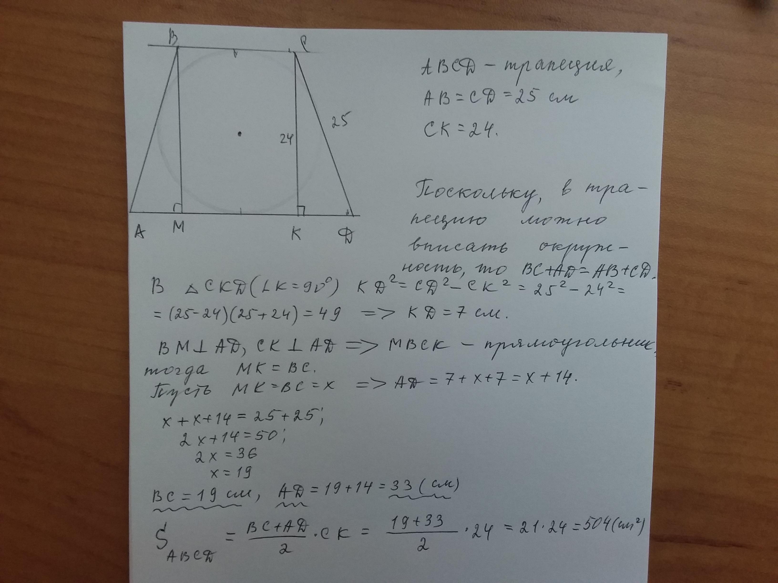 Диаметр окружности равен 24 см. Около неё описана равнобедренная трапеция, боковая сторона которой 25 см.