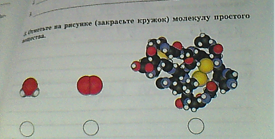 Если текст не видно, то там написано - "Отметьте на рисунке ( закрасьте кружок ) молекулу простого вещества."
