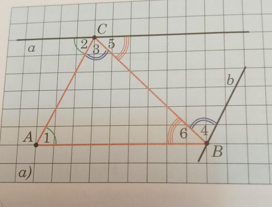 б) рассмотрим углы - 3 и 4 , 5 и 6 , угол3 = углу 4, а угол 5= углу 6 ( накрест лежащие ) то прямая б параллельна прямой АС