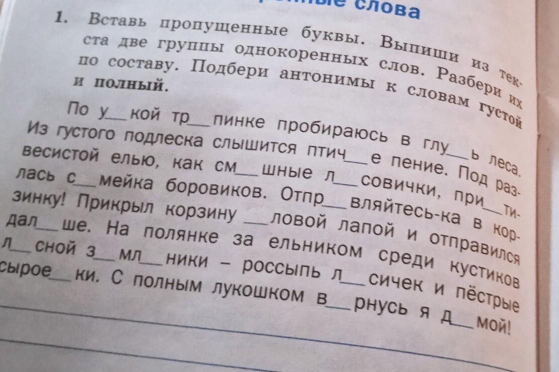 Выпиши из текста две группы однокоренных слов разбери их по составу подбери антонимы к словам грустный и полный