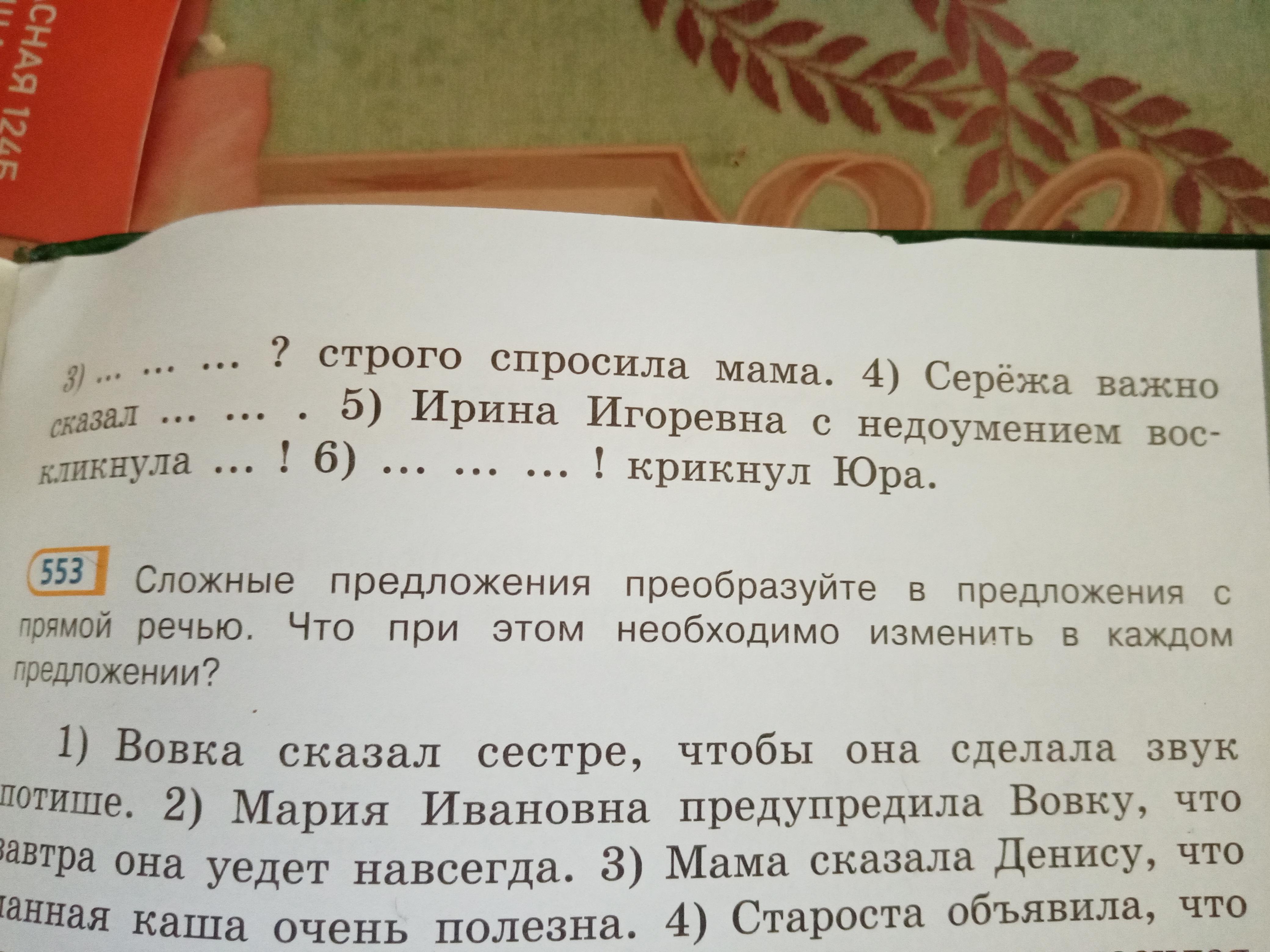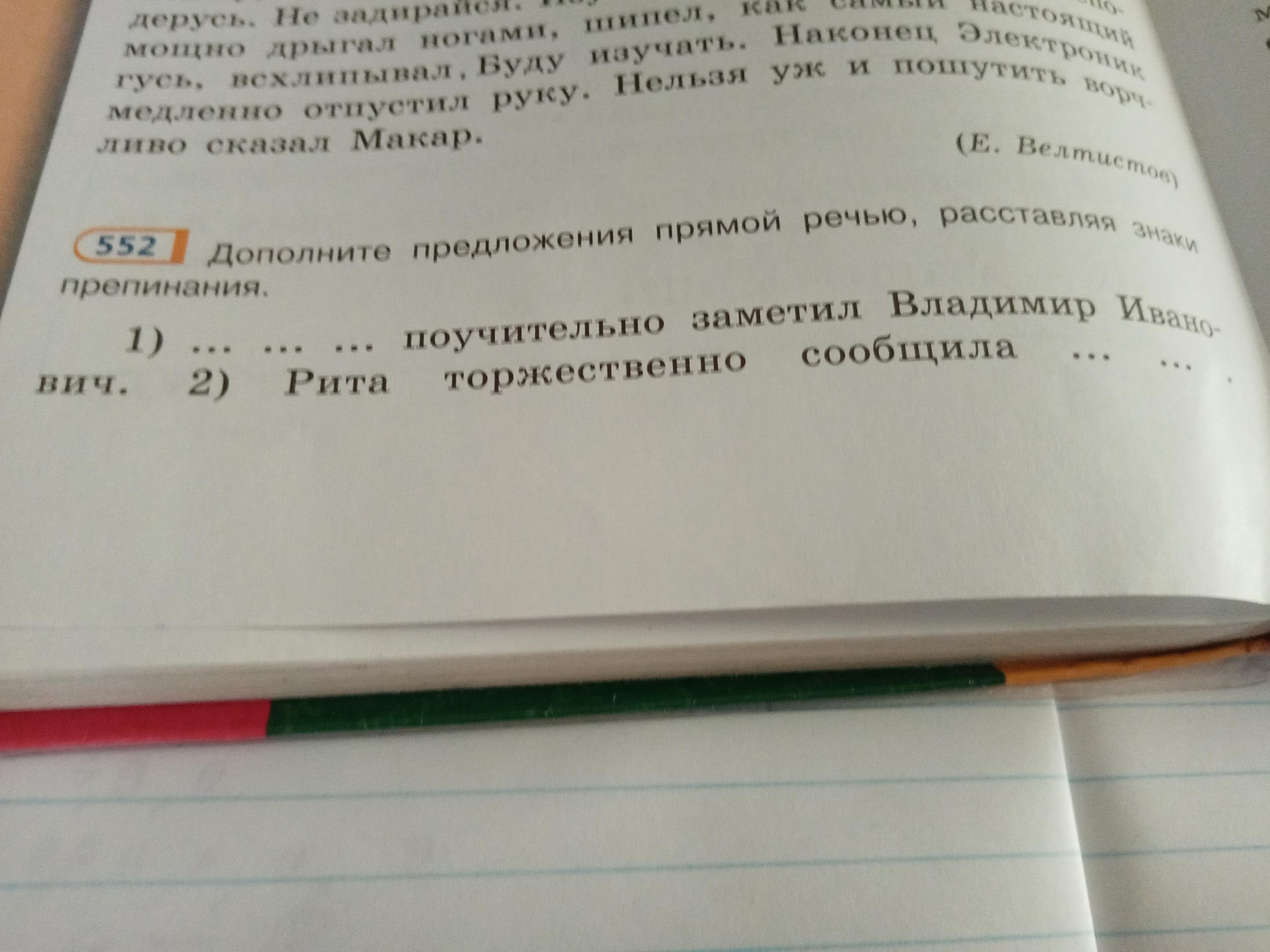 "Нужно беречь природу", - поучительно заметил Владимир Иванович. Рита торжественно сообщила: "Сегодня будет концерт". "Ты уроки сделал?" - строго спросила мама. Серёжа важно сказал: "Меня похвалили в школе". Ирина Игоревна с недоумением воскликнула: "Возмутительно!" "Сегодня начинаются каникулы!" - крикнул Юра.