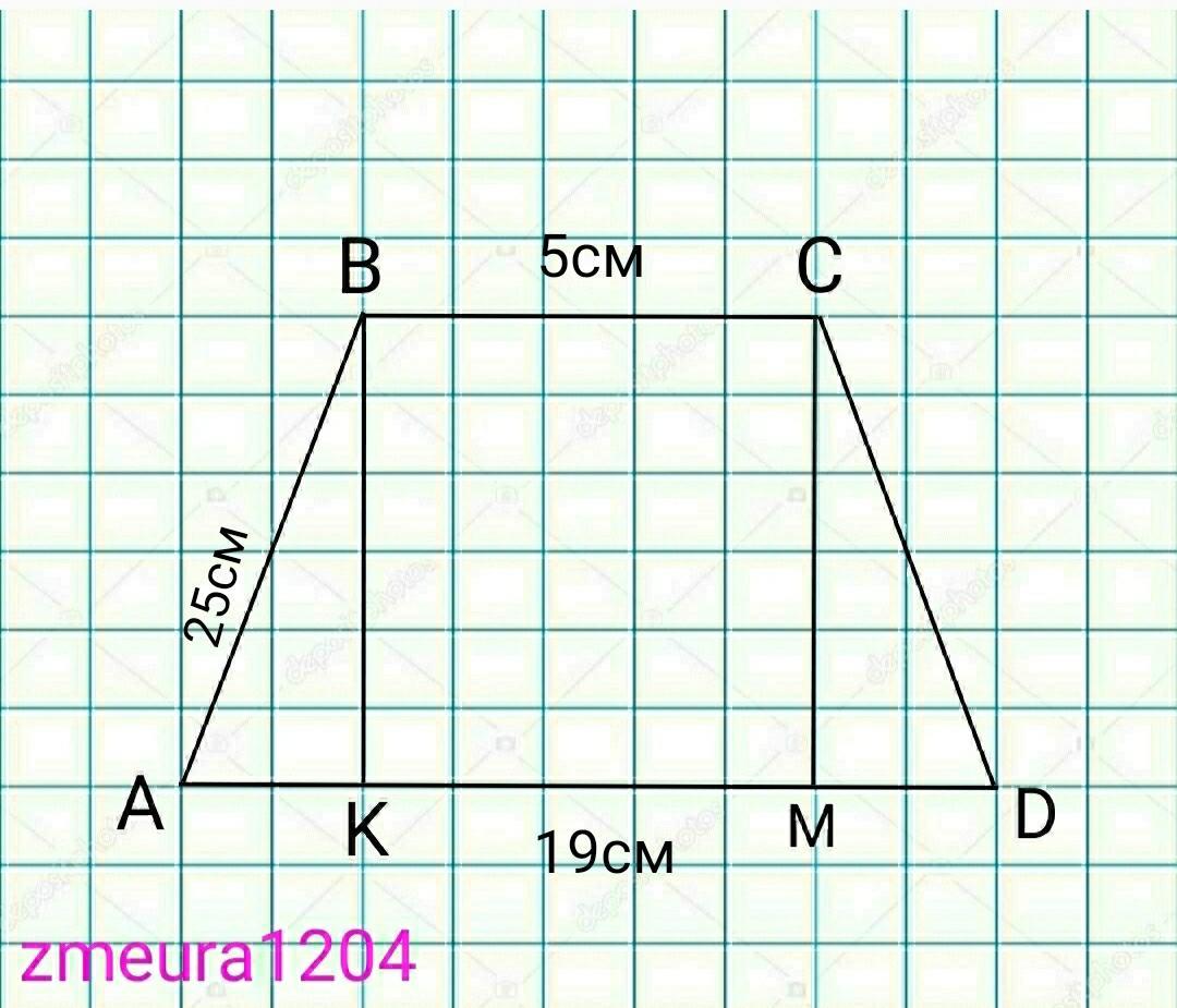 Найдите площадь равнобедренной трапеции если ее основания равны 5 и 19 а боковая сторона равна 25см