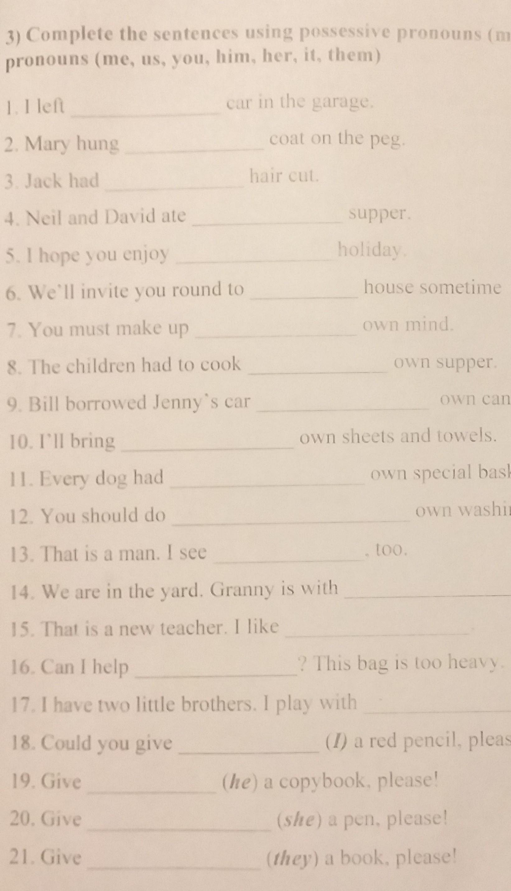 Задание: Complete the sentences using possessive pronouns (my,your,his,her,our,their) and onject pronouns (me, us, you, him, her, it, them) Помогите пожалуйста!!! СРОЧНО!!!