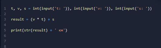 В тетради прописать код программы на Python: 2) Турист проехал на машине t часов со скоростью v километров в час и прошёл s километров пешком. Сколько всего километров пути преодолел турист?
