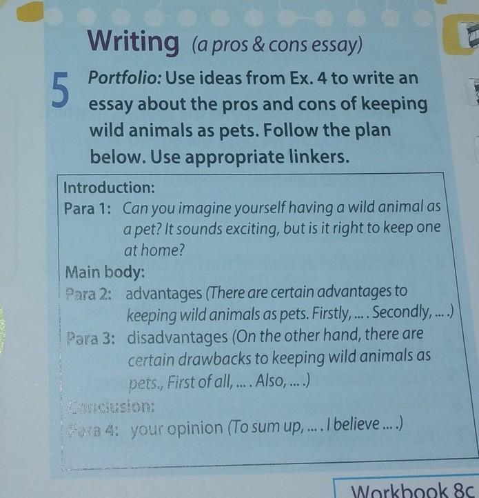 There are certain advantages to keeping wild animals as pets. Firstly, keeping a wild animal asa pet is the best way to learn about them. You can learn how they behave, play or eat. Secondly, you help to protect their species. If you are able to keep more than one wild animal in a safe and healthy environment, you could breed them and help them survive. On the other hand, there are certain drawbacks to keeping wild animals as pets. First of all, owners don't know how to look after them. These animals need special food and care. Also, wild animals can be very dangerous. They are not used to human contact, so they may attack their owners. To sum up, there are strong arguments both for and against keeping wild animals as pets. I believe that we should leave wild animals where they belong, in the wild, and do our best to help protect them in their natural habitats.