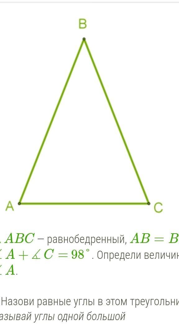 .ΔABC — равнобедренный, AB=BC, ∡A+∡C= 98°. Определи величину∡A.