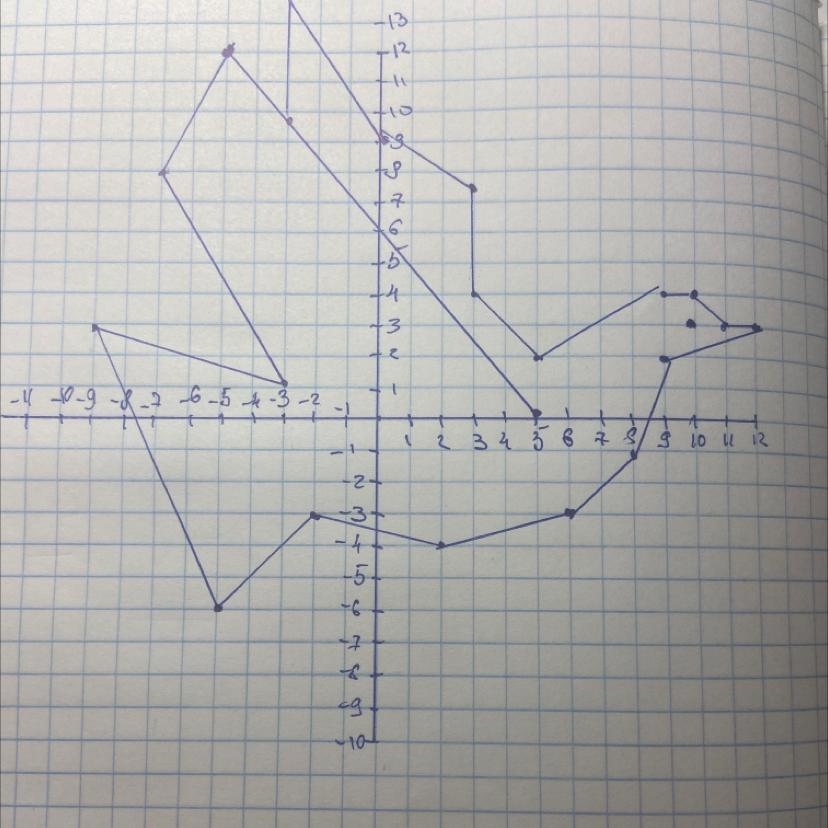 Намалювати координати (5:0),(-5:12),(-7:8),(-3:1),(-9:3),(-5:-6),(-2:-3),(2:-4)(6:-3),(8:-1),(9:2),(12:3),(11:3),(10:4),(9:4),(5:2),(3:4),(3:7,5),(0:9),(-3:14),(-3:14),(-3:9,5),(10:3)