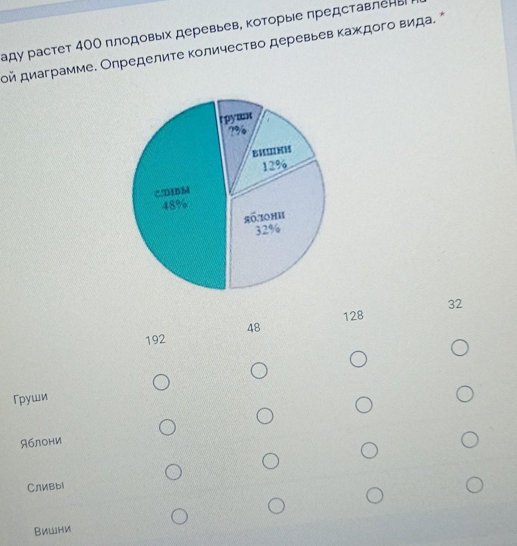 7. В саду растет 400 плодовых деревьев, которые представлены на круговой диаграмме.Определите количество деревьев каждого вида.