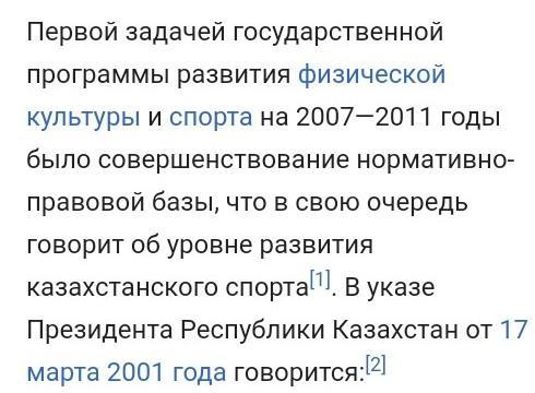 Первой задачей государственной программы развития физической культуры и спорта на 2007—2011 годы было совершенствование нормативно-правовой базы, что в свою очередь говорит об уровне развития казахстанского спорта[1]. В указе Президента Республики Казахстан от 17 марта 2001 года говорится:[2]