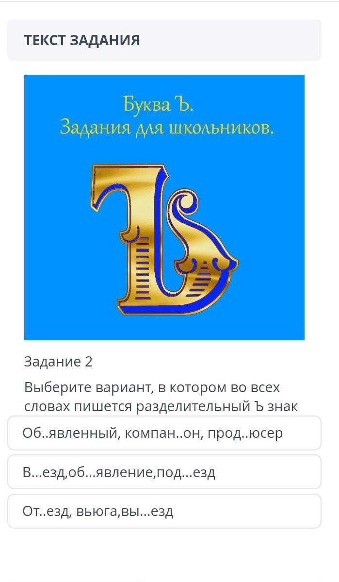 Задание 2 Выберите вариант, в котором во всех словах пишется разделительный Ъ знак Об..явленный, компан..он, прод..юсер B...e3A,06 ...явление,под...езд От..езд, вьюга,вы...езд