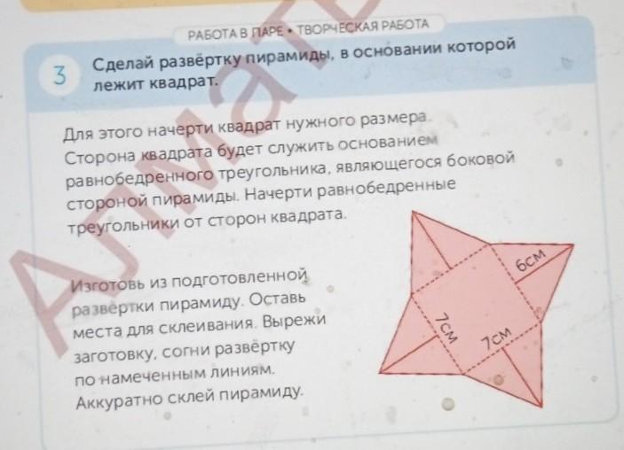 Ответ: сделай точно так же резать в нём ничего не надо 4 треугольника соединённым с квадратом у которого сторона 7см треугольник 6см,потом нагни треугольники (не там где линия внутри треугольника)на краях квадрата,и соедини все треугольники,чтобы получалась пирамида