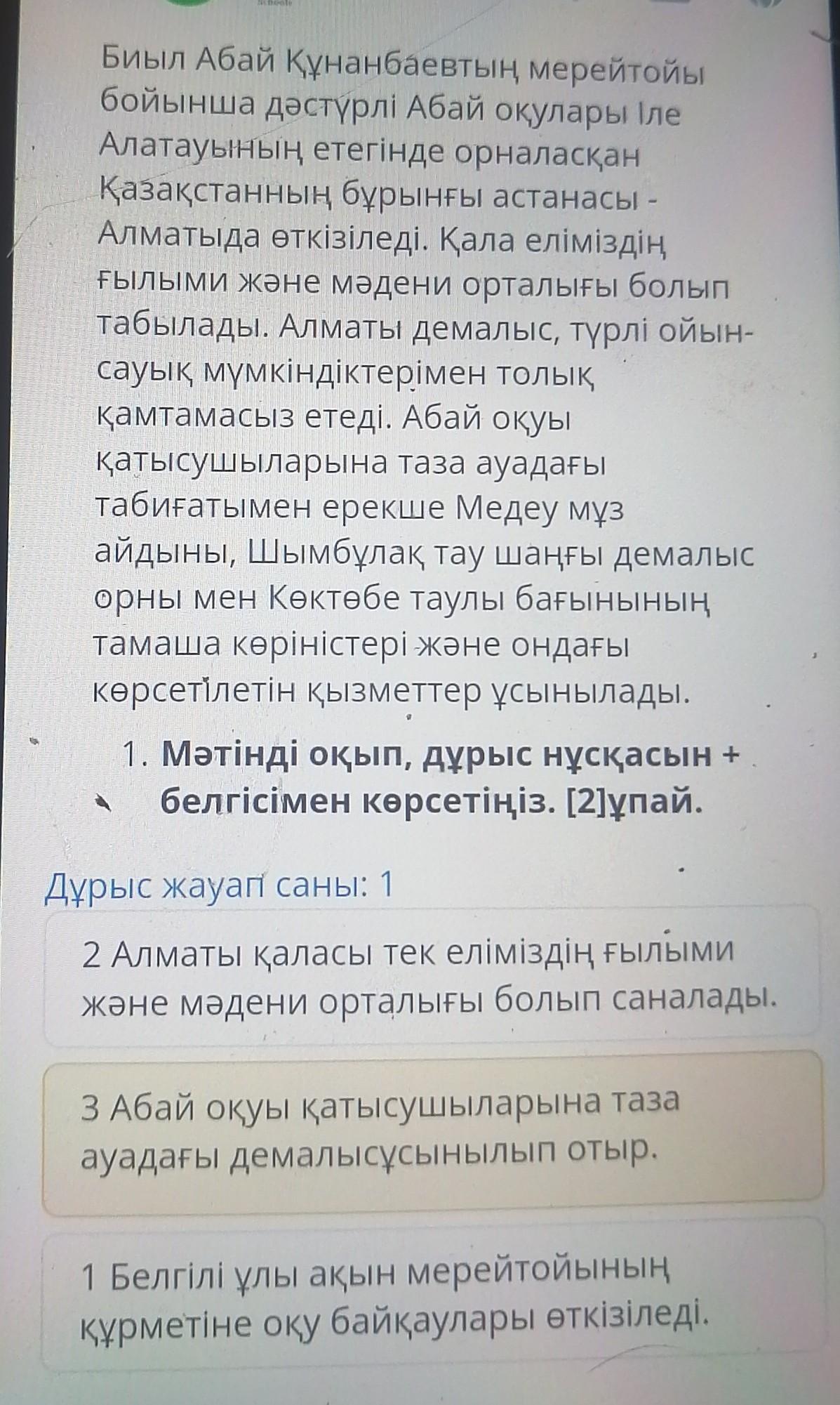 1. Мәтінді оқып, дұрыс нұсқасын +