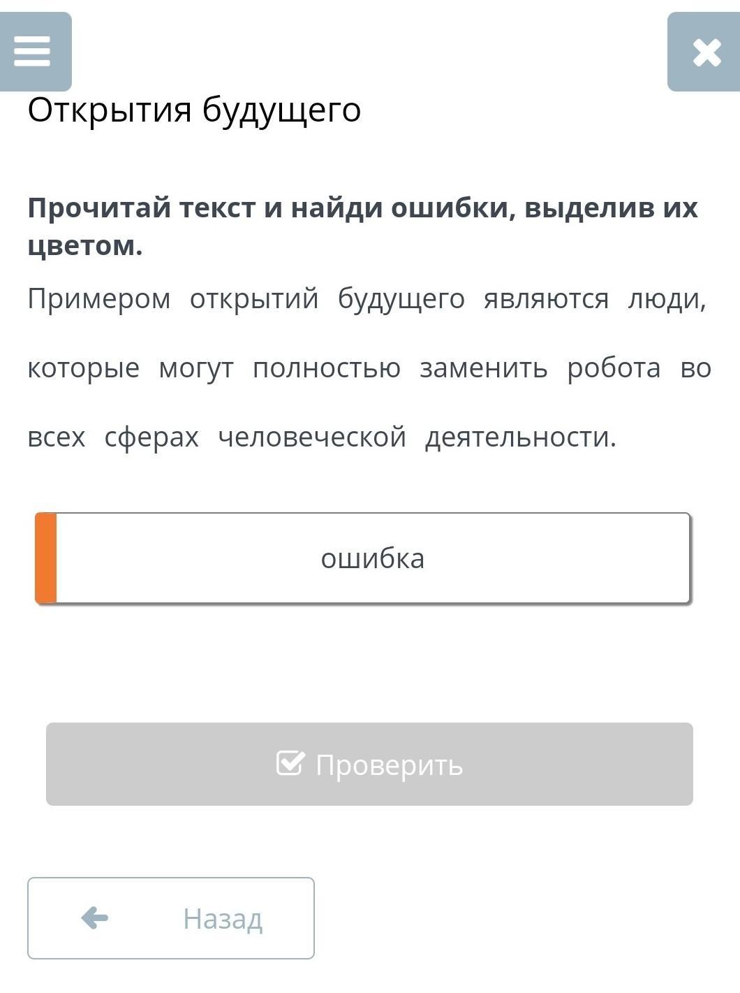 Прочитай текст и найди ошибки, выделив из цветом. примером открытий будущего являются люди, которые могут полностью заменить работа во всех сферах человеческой деятельности ошибка