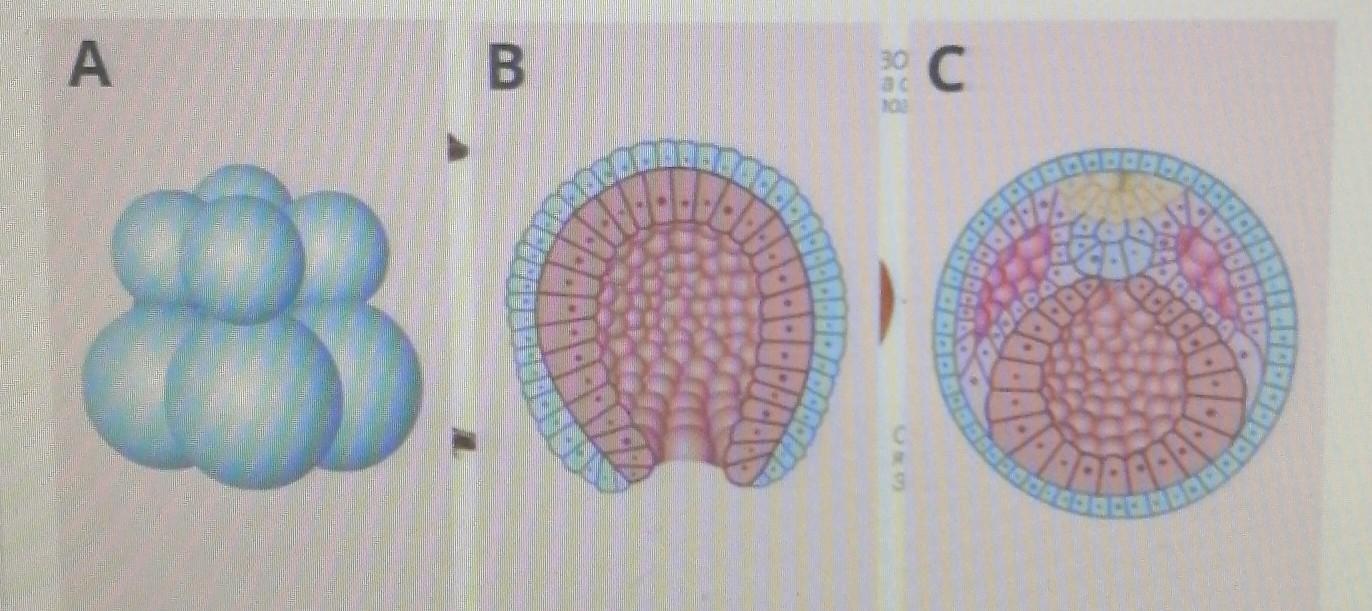 Объяснение:А-бластула, В- гаструла, С-нейрула.