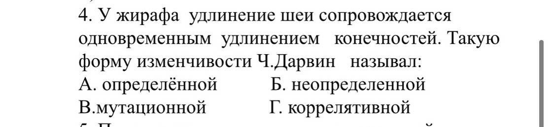 У жирафа удлинение шеи сопровождается одновременным удлинением конечностей. Такую форму измннчивости Ч. Дарвин нызывал: