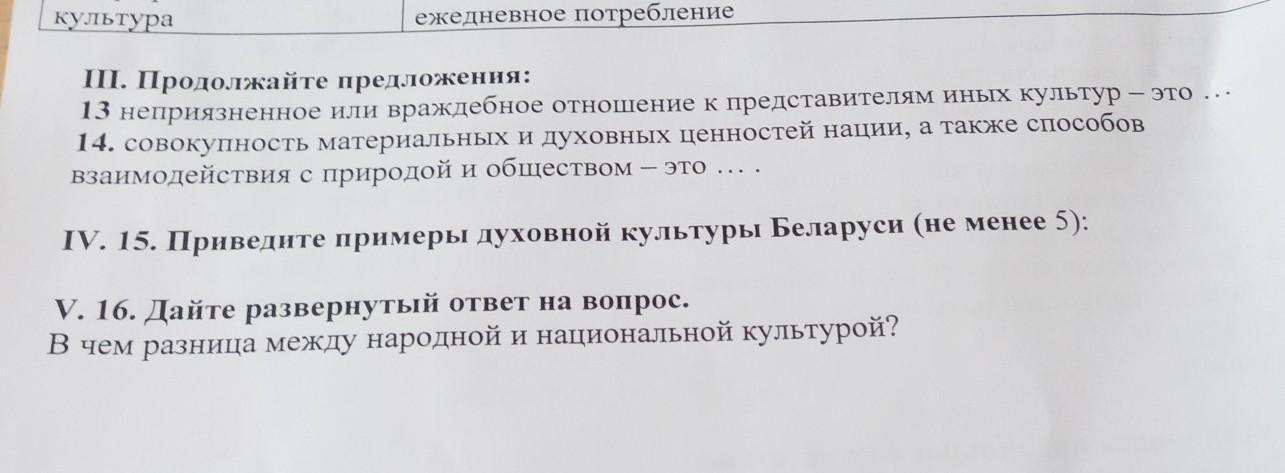 15-Различают материальную и духовную культуру. Материальная культура охватывает материальное производство. Она определяется уровнем развития техники, транспорта, средств связи и т. п. и является показателем уровня практического освоения человеком природы. Духовная культура - это духовное производство: идей, идеалов, знаний, предметов искусства, традиции и обычаи, моральные и правовые нормы и т. д. Примеры материальной культуры: дома, одежда, машины и любая техника, например холодильник или сотовый телефон, лекарства, продукты, приготовленные человеческими руками, а не взятые прямо из природы. . Примеры духовной культуры: сказки, эпос разных народов, песни, музыка, танцы, философские идеи и религиозные обряды и молитвы. Можно причислить и к материальной и к духовной культуре также книги и произведения исусства. С одной стороны, они изготовлены руками человека, с другой - они показывают идеи и духовную работу, которую человек вложил в эти вещи.
