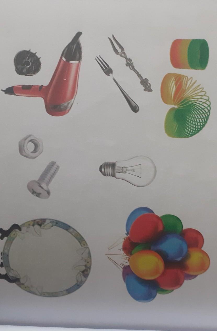 На фото я вижу две вилки, воздушные шары, блюдце, шуруп и гайку, а также фен, лампочкук, и гармошку (или как она называется), возможно я не до конца понял вопрос