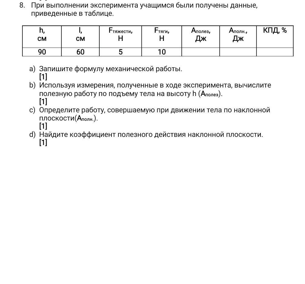 Используя измерения, полученные в ходе эксперимента, вычислите полезную работу по подъему тела на высоту h (Aполез). [1]