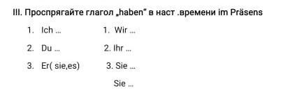 1.habe 2.hast 3.hat 4.haben 5.habt 6.haben
