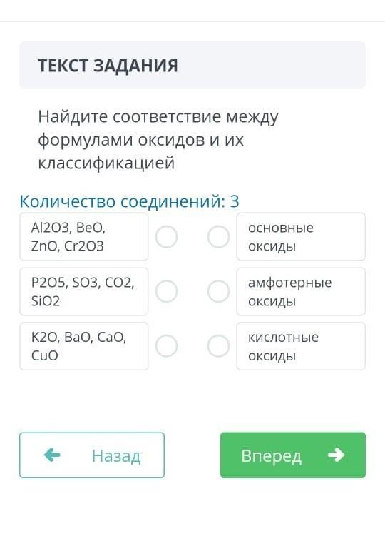 ЗАДАНИЯ Найдите соответствие между формулами оксидов и их классификацией Количество соединений: 3 AI203, BeO, основные ZnO, Cr203 оксиды Р205, SO3, CO2, амфотерные Sio2 оксиды К20, ВаО, СаО, кислотные оксиды