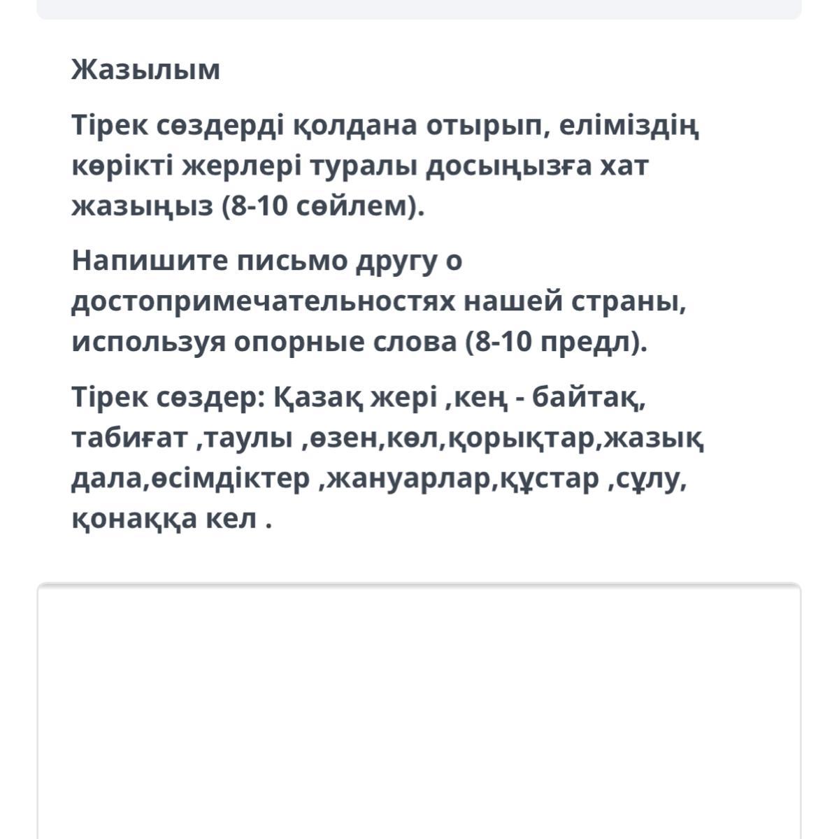 Сәлем. Демалыс күндері қонаққа кел. Кең байтақ қазақ жерінің табиғатын көресің. Сонау таулы жерлерден бастап жазық далаға дейінгі сұлулыққа тамсанасың. Қазақстанның табиғаты таңғажайыпқа бай. Қорықтар мен өзен-көлдердің флорасы мен фаунасын көрерсің. Неше түрлі құстар, өсімдіктер және жануарлар дүниесінің кереметтігі сонша, көз алу мүмкін емес. Мен айтқаннан ештеңе өзгермес, өзің келіп, өз көзіңмен көргенге ештеңе жетпейді. Жарайды, көріскенше,. сау бол. Осы демалыста міндетті түрде кел!