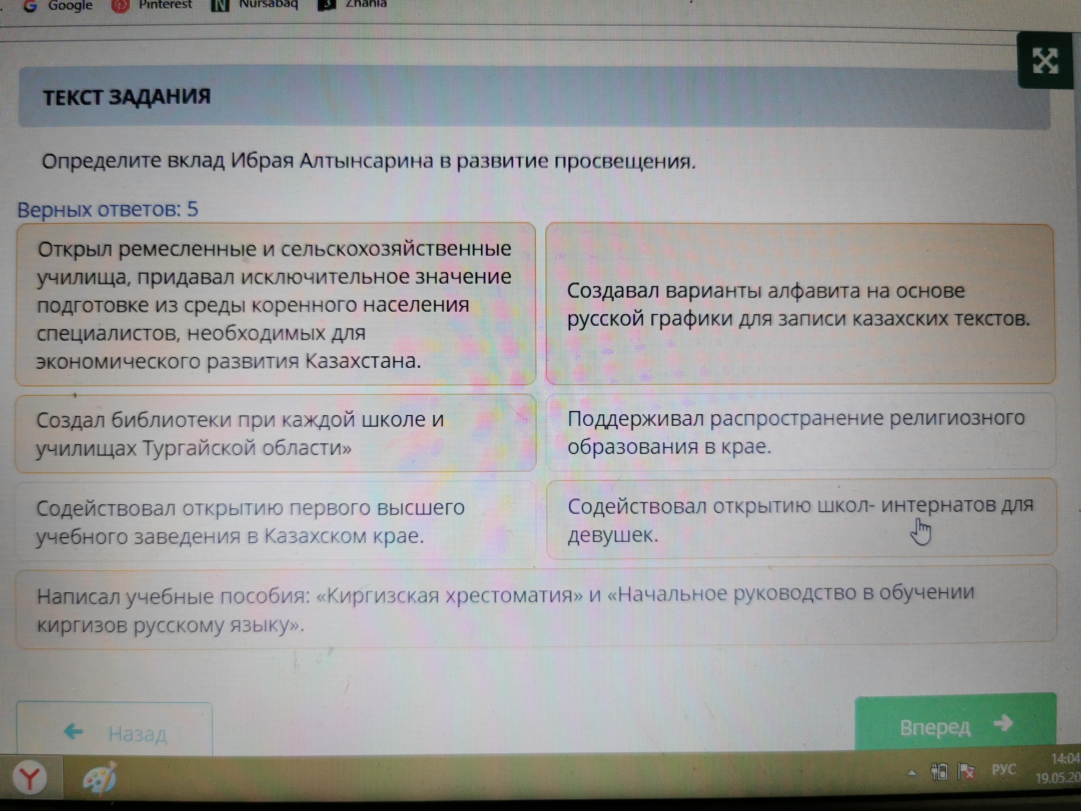 Определите вклад Ибрая Алтынсарина в развитие просвещения,