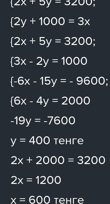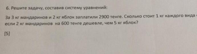 За 3 кг мандаринов и 2 кг яблок заплатили 2900 тенге. Сколько стоит 1 кг каждого вида ,если 2 кг мандаринов на 600 тенге дешевле ,чем 5 кг яблок
