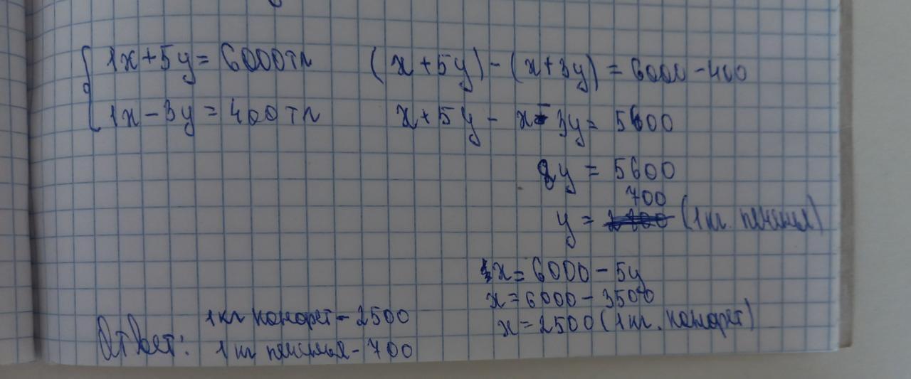 . Решите задачу, составив систему уравнений. За килограмм конфет и 5 килограммов печенья заплатили 6000 тг. Сколько стоит килограмм конфет и килограмм печенья, если 3 килограмма печенья на 400тг дороже 1 килограмма конфет? ПОМОГИТЕ ПОЖАЛУЙСТА