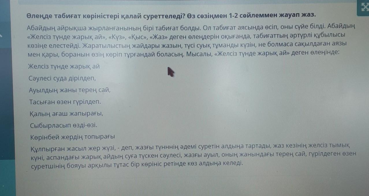Өлеңде табиғат көріністері қалай суреттеледі? Өз сөзіңмен 1-2 сөйлеммен жауап жаз.