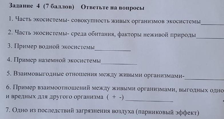 1. сообщество растений, животных и микроорганизм . 2. рельеф ,температура и влажность воздуха ,освещенность, течение и ветер. 3.как; реки, озера, болота ,пруды 4.например; прирост деревьев лесу; рост трав на сезон вегетации; созревание плодов и семян итд . 6.+