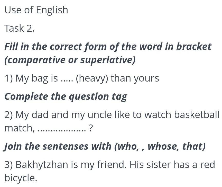 Fill in the correct form of the word in bracket (comparative or superlative) 1) My bag is . (heavy) than yours Complete the question tag 2) My dad and my uncle like to watch basketball match, Join the sentenses with (who, , whose, that) 3) Bakhytzhan is my friend. His sister has a red bicycle.