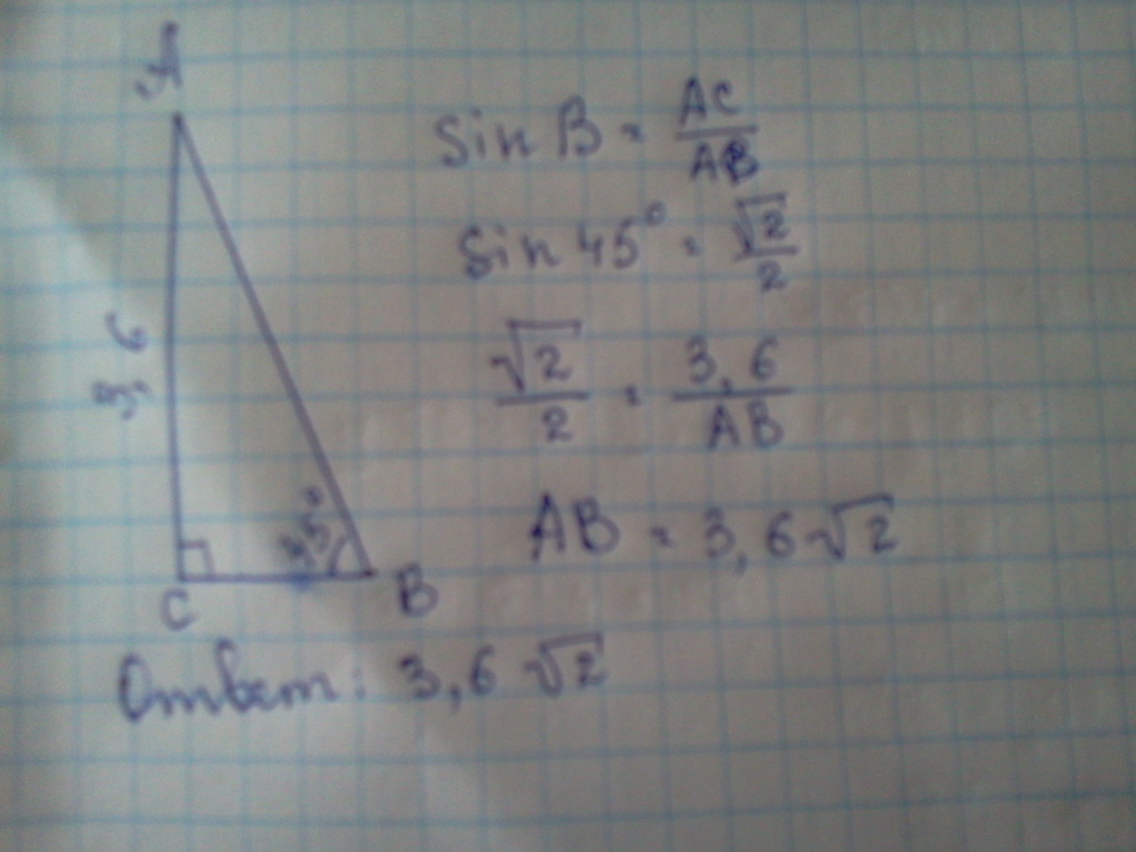 Найти длину гипотенузы AB прямоугольного треугольника ABC, если известно, что: AC= 3.6 дм B= 45градусов