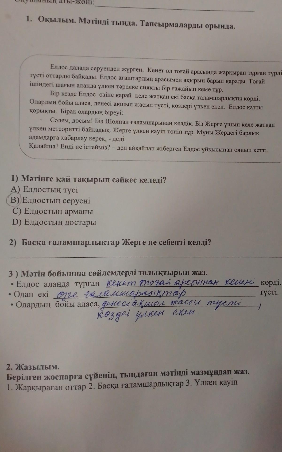- Сəлем ! Біз Шолпан ғаламшарынан келдік . Біз жерге ұшып келе жатқан метеоритті көрдік . Жерге үлкен қауіп төніп тұр . Оны барлық адамдарға айт