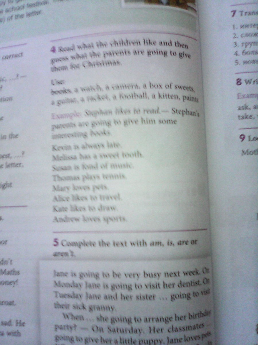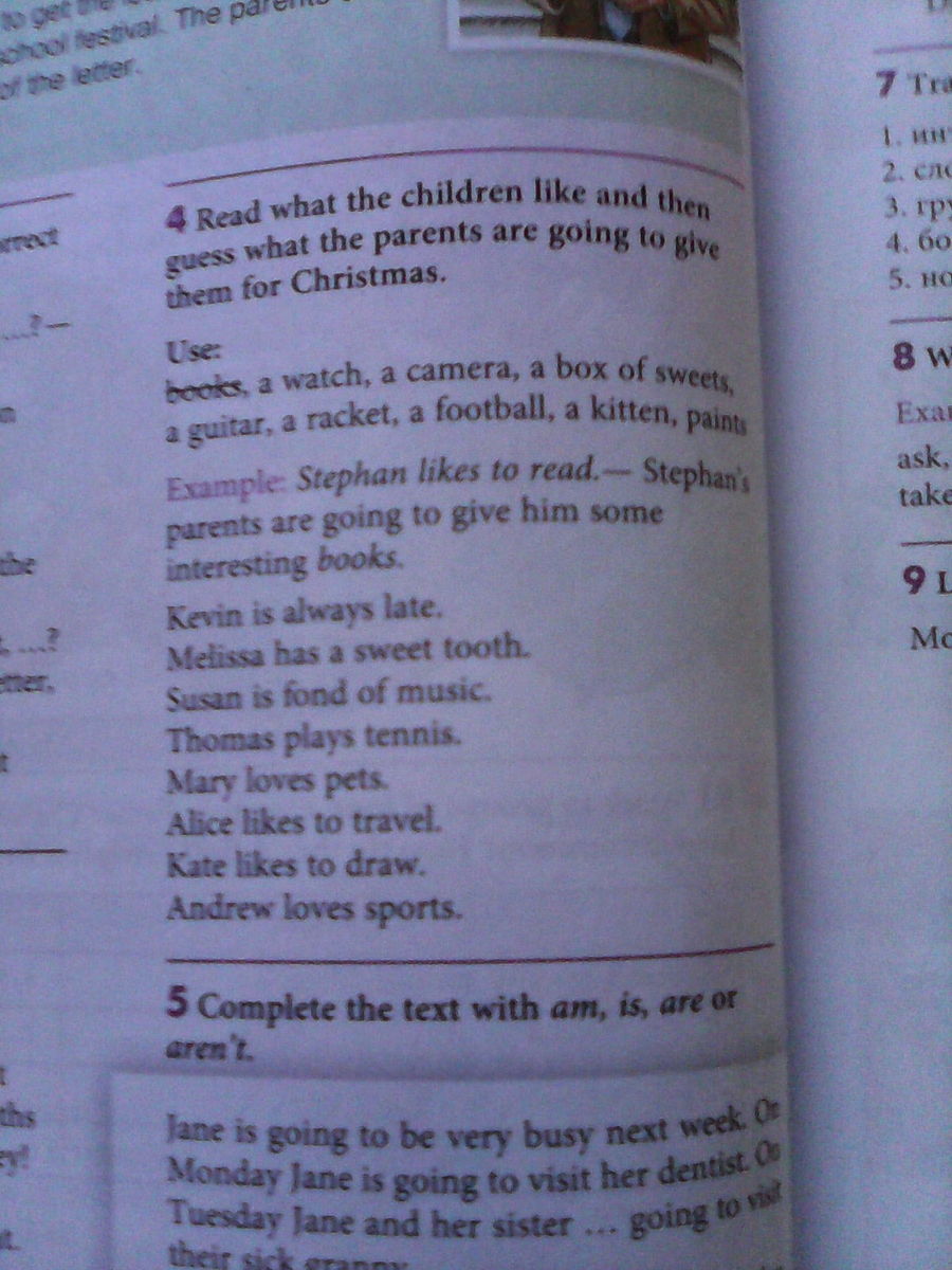 1. Kevin's parents are going to give him a watch 2. Melissa's parents are going to give her a box of sweets 3. susans parents are going to give her a guitar 4. thomas's parents are going to give him a racket 5. Marys parents are going to give her a kitten 6. Alice's parents are going to give her a camera 7. Kate's parents are going to give her a paints 8. Andrews parents are going to give him a football