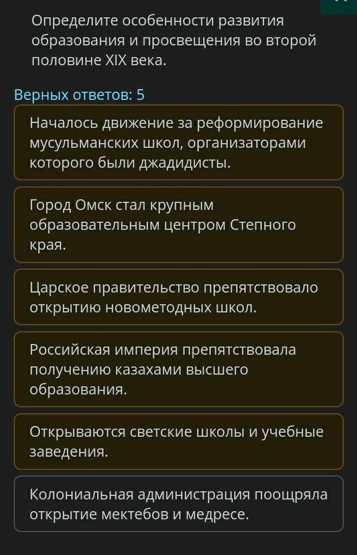 СРОЧНО ПОМОГИТЕ Определите особенности развития образования и просвещения во второй половине XIX века. Верных ответов: 5 Началось движение за реформирование мусульманских школ, организаторами которого были джадидисты. Город Омск стал крупным образовательным центром Степного края. Царское правительство препятствовало открытию новометодных школ. Открываются светские школы и учебные заведения. Российская империя препятствовала получению казахами высшего образования. Колониальная администрация поощряла открытие мектебов и медресе.